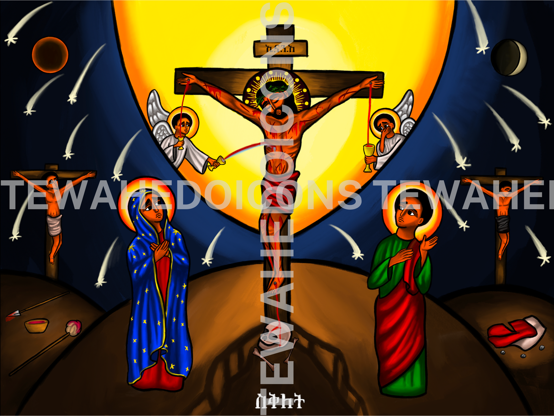 This is Christ’s Crucifixion on Good Friday, as told in John 19:17–37. Jesus hangs on the Cross, crucified for the sake of His children. His body is lifted in sacrifice, and His eyes are turned heavenward as He cries out to the Father, fulfilling the Scriptures. At His